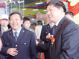 图为中共荆门市委书记傅德辉(右)在湖北省质监局副巡视员、荆门市质监局局长张剑(左)的陪同下,参观第八届中国艺术节荆门分会场精品名牌展。