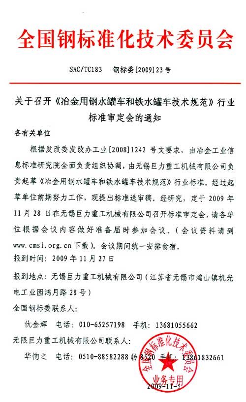 关于召开《冶金用钢水罐车和铁水罐车技术规范》行业标准审定会的通知