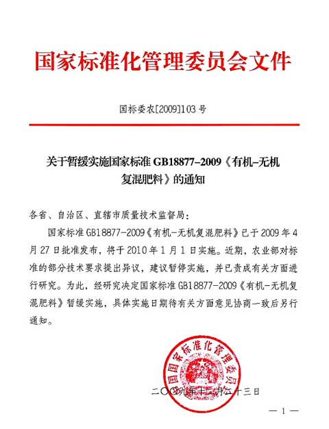 关于暂缓实施国家标准《有机-无机复混肥料》的通知
