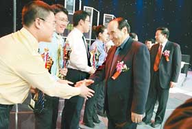 图为阿不来提·阿不都热西提、王勇向“全国质量知识竞赛”获奖选手表示祝贺,并与选手亲切握手。记者 王 嘉 摄
