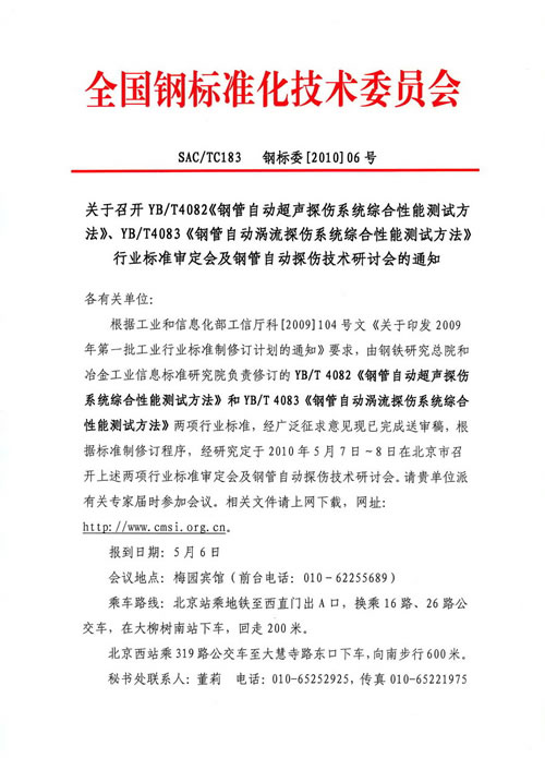 《钢管自动超声探伤系统综合性能测试方法》等行业标准审定会通知