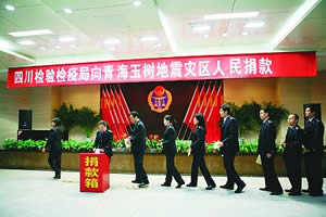 为了帮助青海省玉树县灾区人民渡过难关,四川检验检疫局机关全体干部职工在局党组的带领下,纷纷行动起来,以捐款的方式为灾区人民奉献爱心。据统计,四川检验检疫局机关全体干部职工一次性捐款48250元。岳川 罗媛 摄