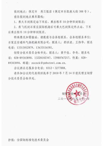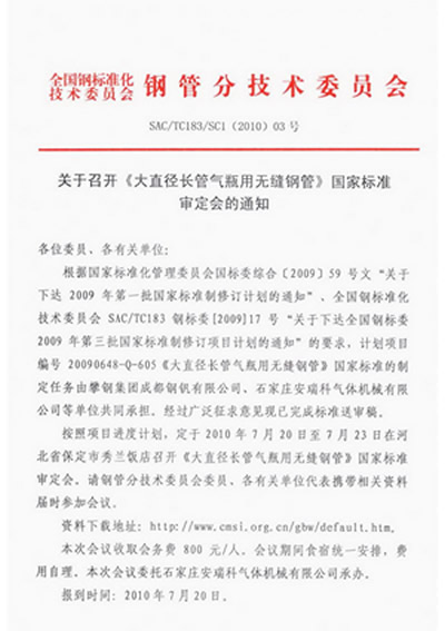 关于召开《大直径长管气瓶用无缝钢管》国家标准审定会的通知