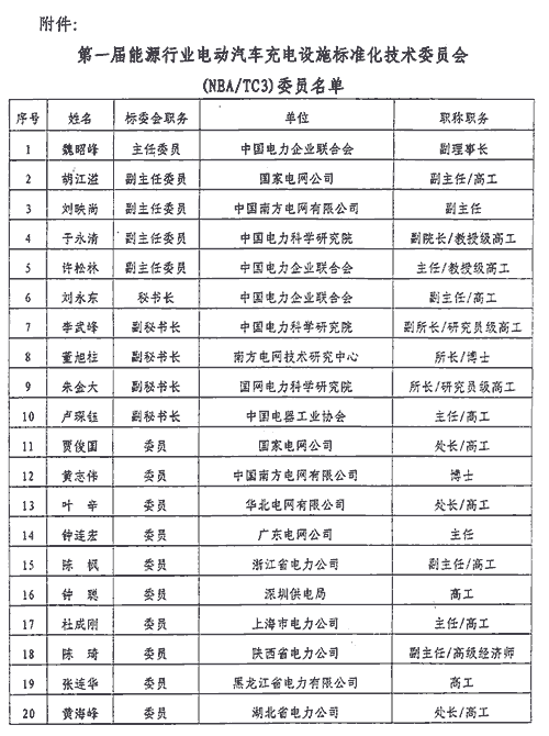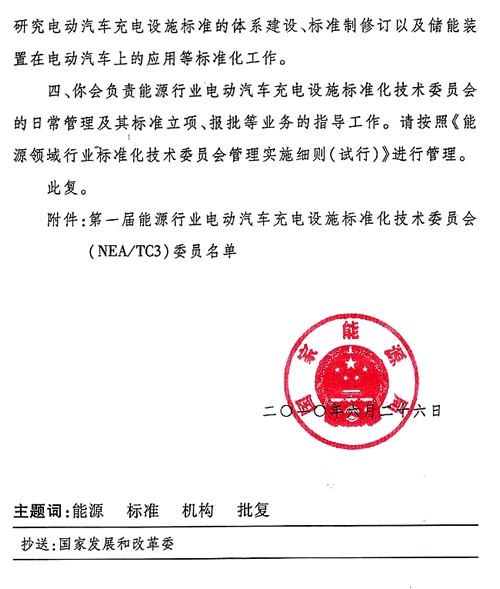 国家能源局关于成立能源行业电动汽车充电设施标准化技术委员会的批复