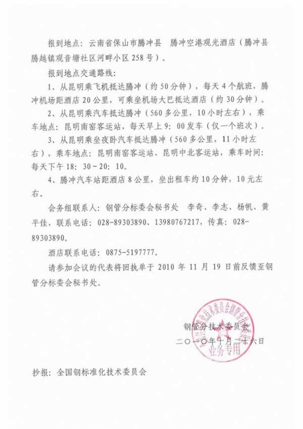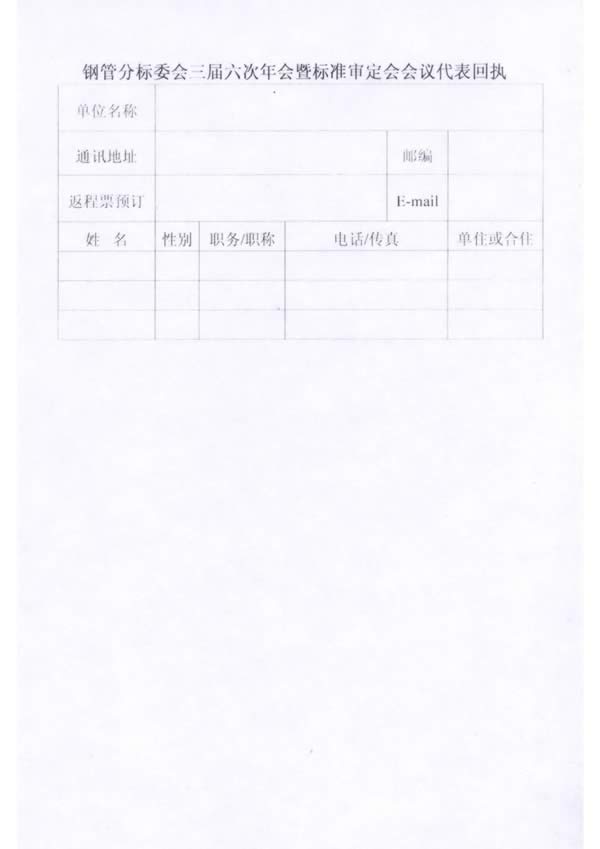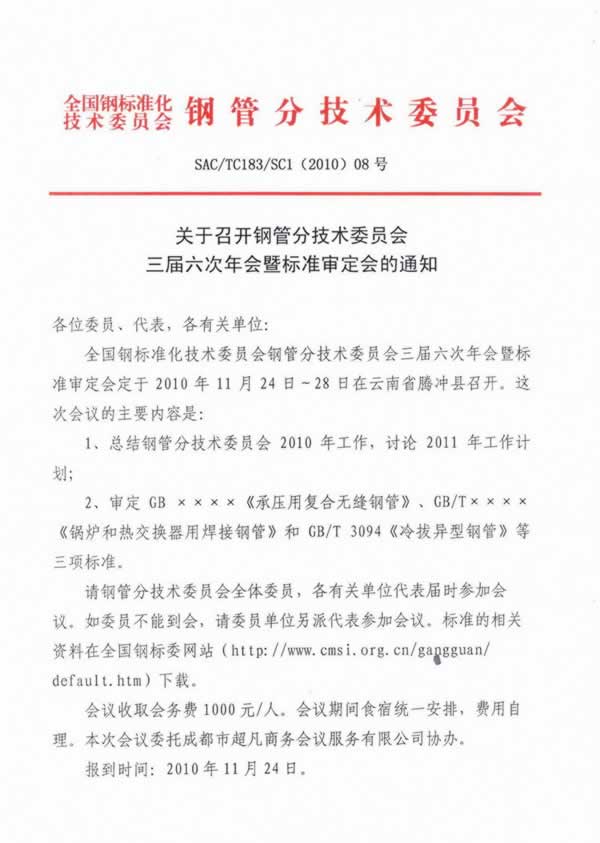 全国钢标准化技术委员会钢管分技术委员会三届六次年会通知