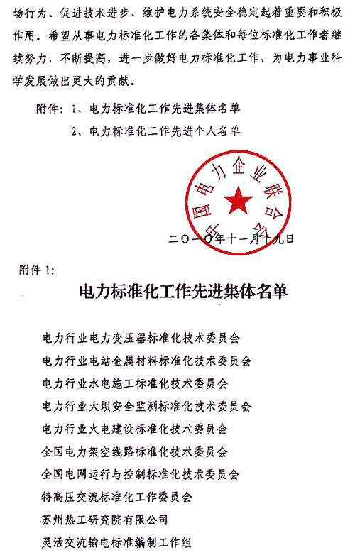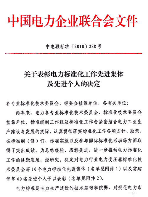 关于表彰电力标准化工作先进集体及先进个人的决定
