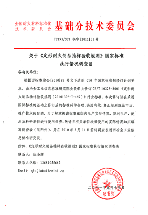 《定形耐火制品抽样验收规则》国家标准执行情况调查函