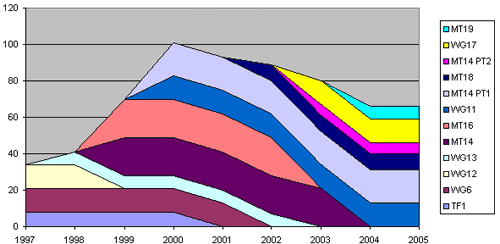 图3示出了1997年至2005年之间相关用户、制造商、试验机构或顾问等专家分布情况: WG和 MT中制造商专家的百分比基本上相对稳定,但用户人数从20%下降到10%左右,同时也可看到试验研究所或顾问百分数增加了,代替了减少的用户人数。