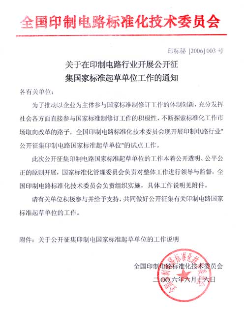 1、申请承担以上某项印制电路国家标准起草工作的单位须认真填写公开征集国家标准起草单位项目申报书(见附件1),并于2006年7月30日前报全国印制电路标准化技术委员会;