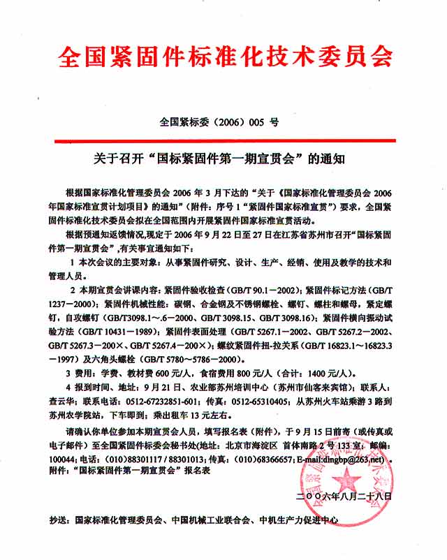 关于召开“国标紧固件第一期宣贯会”的通知