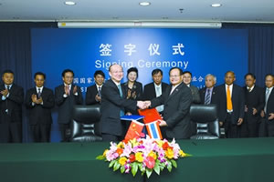 4月21日,国家质检总局局长支树平会见了泰国农业与合作部部长提拉·翁萨穆一行。宾主就加强两国在农产品和食品进出口检验检疫领域的合作等议题进行了会谈,并签署了《中华人民共和国国家质量监督检验检疫总局和泰国农业与合作部关于双方经昆曼公路进出口水果的检验检疫要求议定书》。国家质检总局国际司、动植司、通关司、国家认监委、国家标准委、食品局以及泰国驻华大使馆等有关人员参加了会谈和签字仪式。