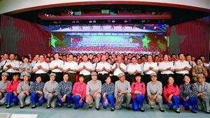 图为质检总局领导和老领导代表与红歌演唱会演员亲切合影留念