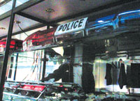 该店面积有20平方米左右,店内进门处的北墙上挂着几件有警章的警服。南北两边各立有一排玻璃橱窗,在橱窗内摆有警用电棍、电棍棒、警灯、催泪瓦斯等多种警用器械,价钱由几十元至几百元不等。来店中询问的顾客人流不断,记者注意到在该店北侧的橱窗内摆放着一张营业执照和一张由北京市公安局下属某部门颁发的许可证复印件,上面注明经营公司为北京九州华安科贸有限公司。
