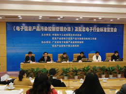 1月23-24日,《电子信息产品污染控制管理办法》及配套电子行业标准宣贯会在广州隆重召开。本次会议是在信息产业部科学技术司与经济运行司共同指导下,由中国电子工业标准化技术协会主办,广东省电子电器产品监督检验所承办。来自信息产业部、电子标准化研究所的官员和专家、相关协会、企业、检测机构的代表汇聚一堂,为企业应对《电子信息产品污染控制管理办法》展开热烈讨论。