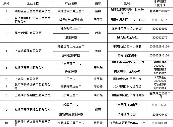 抽查结果表明:一是国家免检产品质量有保证,抽查的9家企业生产的14种国家免检产品,全部合格;二是大中型企业的产品质量继续保持较高水平,合格率在90%以上;三是卫生巾产品卫生状况总体良好,微生物指标合格率为97.3%,未检出大肠菌群和致病性化脓菌。 抽查中发现的主要质量问题: 1、个别产品微生物指标超标。强制性国家标准GB15979-2002《一次性使用卫生用品卫生标准》对微生物指标进行了严格的规定。抽查中有个别产品微生物指标中的细菌菌落总数和真菌菌落总数超标。 2、个别产品pH值超标。卫生巾(含卫生护垫)的pH值中性时,对人的皮肤刺激性最小。标准中规定优等品pH值范围为5.5~8.0、一等品及合格品为5.3~8.2。抽查中有个别产品pH值超过国家标准规定的要求。 3、部分产品标识标注不规范。按照《产品标识标注规定》和强制性国家标准GB8939-1999《卫生巾(含卫生护垫)》规定的要求,产品必须在销售包装上明示产品名称、生产单位名称和地址、生产日期和保质期或失效日期、执行标准、质量等级等项目。抽查中有部分产品标识标注不规范,主要是未标注产品名称、质量等级或生产单位名称、地址等。 针对抽查中反映出的主要质量问题,国家质检总局已责成各地质量技术监督部门严格按照产品质量法等有关法律法规的规定,对抽查中产品质量不合格的企业依法进行处理,限期整改。同时,对抽查中质量较好的企业,要加大宣传力度。国家质检总局将继续对该类产品质量进行跟踪抽查,促使卫生巾行业整体质量水平的提高,为消费者创造放心满意的消费环境。 ![]() 注:排名不分先后。 卫生巾(含卫生护垫)产品质量国家监督抽查部分质量较差的产品及其企业名单 ![]() 注:排名不分先后。 如何选择使用卫生巾 1、消费者选购时应察看产品标识,并尽量选择近期生产的产品。卫生巾外包装应有卫生许可证号、生产日期、保质期或有效期、执行的标准编号、生产者名称和地址等信息。 每个外包装和独立小包装的封口应平滑,无漏气现象;好的卫生巾应表面清洁,厚薄均匀,封口无损。另外,从手感来看,好的卫生巾由吸收性强,蓬松性好的绒毛浆制作,所以又轻又软。如果掺有其他纸浆、下脚料等的卫生巾则又重又硬。 2、首选大型商场、超市销售的市场占有率较高的知名企业生产的名牌产品。 3、选择卫生巾要注重自身的感受。目前卫生巾的种类很多,有棉面、网面还有香型及药物卫生巾等,要根据自己使用的实际感受来挑选最适合自己的卫生巾。 4、科学使用卫生巾。一般女性经期可分为三个阶段,可根据这三个阶段选择使用不同型号的卫生巾。月经量很大时,白天需用护翼型,晚间需用夜安型;平时可使用标准型;月经前后可使用超薄型或护垫。这种搭配选择一方面是为了安全、舒适,另一方面也是为了节省经期花费。 5、一般情况下,很难保证每次都能用完一整包卫生巾,特别是上班族女性经常需要随身携带一、二片,而整包卫生巾一经打开,很容易造成污染,所以从卫生角度看,宜购买独立包装的卫生巾。若还要考虑经济因素,则可购买不带独立包装,但每包片数较少的卫生巾。 6、使用过程中防止“再污染”。使用前最好要洗手,尽量不要用手接触卫生巾的表面,避免二次污染。另外,在使用卫生巾时,应做到及时更换。 |