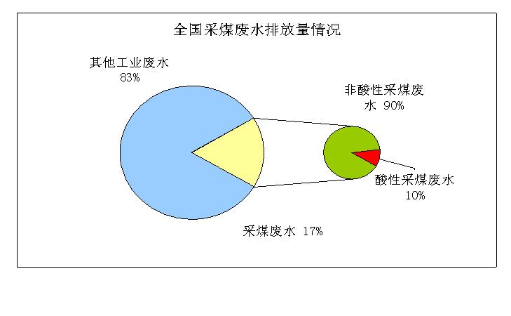 煤炭在我国能源结构中占主导地位,煤炭工业是我国重要的基础能源产业。2004年我国煤炭产量达到19.56亿吨, 2005年已超过20亿吨。煤炭大量开采,排放大量污染物,对生态环境造成较严重的影响。据典型调查统计,2004年我国煤矿排放废水约为36~40亿吨,占当年全国工业废水排放总量的17.2% 。其中,酸性矿井水占采煤废水排放量的10%左右,见图1。此外,煤炭开采、分选、储存、运输等环节中煤尘的排放问题也比较严重。据估计,未采取控制措施情况下,煤尘的排放导致约1~2%的煤炭资源损失。在固体废物方面,据统计,采煤和选煤每年产生并排放煤矸石约2亿吨,占全国工业固体废物排放量的20%左右,是工业固体废物排放第一大户。
