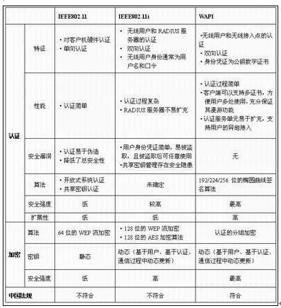 以下为中国无线标准WAPI与802.11及802.11i标准的对比图表:(资料来源:中国宽带无线IP工作组,《计算机世界》“中国无线标准悬疑”文章提供。)