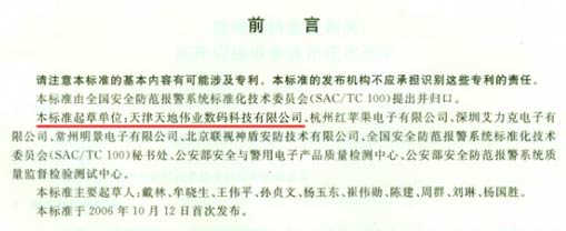 由全国安全防范报警系统标准化技术委员会(SAC/TC100)提出并归口的《中华人民共和国公共安全行业标准》正式发布了,这是中国安防行业起草的第一个行业标准,天地伟业参与起草、修订了多项中国安防产品的国家标准,其中包括作为第一起草人的《视频安防监控系统矩阵切换设备通用技术要求》,并全面参与了《视频安防监控系统 变速球型摄像机》与《视频安防监控系统 前端设备控制协议V1.0》等多项产品国家标准的起草、修订。