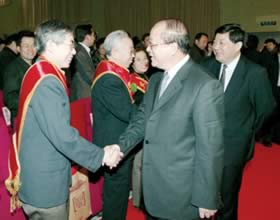 图为李长江、李传卿向获得2006年度国家科技进步一等奖的中国计量科学研究院“NIM4激光冷却-铯原子喷泉时间频率基准装置的研究” 课题组人员表示祝贺。李长春 摄