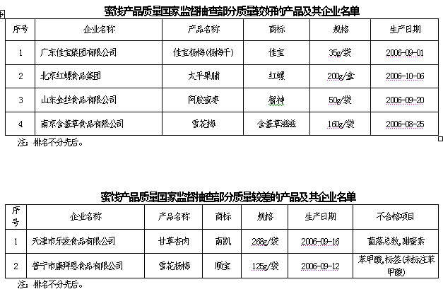 为了维护消费者的合法权益,进一步促进蜜饯行业的健康发展,国家质检总局组织对蜜饯产品质量进行了国家监督抽查。共抽查了北京、天津、河北、河南、山西、山东、上海、江苏、浙江、福建、广东等11个省、直辖市42家企业生产的52种产品,产品抽样合格率为76.9%。