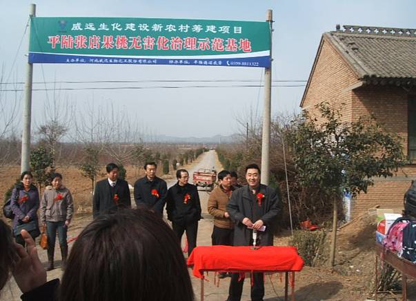 3月中旬,继2006年11月份聘请农大教授为山西省平陆县的老百姓送来了科技帮扶的“盛餐”后,威远生化又一次来到了这个国家级贫困县,再一次零距离接触当地农民,现场为农民朋友提供农药技术咨询服务,并在该县张店镇举行了“平陆张店无害化示范基地”和“平陆百亩无害化示范桃园”的揭牌仪式。