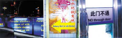 其实,公共标识里所犯的翻译错误远不止这些,“注意路滑”翻译成“To Take Notice of Safe”(要注意保险箱)或者是“The Slippery are Very Crafty(那些滑的是非常狡猾的)”;把“红烧狮子头”直白地翻译为“Red burned lion head(烧红了的狮子头)”;“松榆南路”翻译成“SONGYUNANLU”,这纯拼音式的翻译让一个找路的外国游客研究了半天却依旧不知所云……这可不是网上流传的段子笑话,而是眼前看得见摸得着的牌子。您别笑,就在一两年前,这些让人不知所云甚至是哭笑不得的chinglish(中式英语)还堂而皇之地“挂”在北京大大小小的公共场所里。