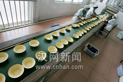 最后一道工序是化验人员对每批产品抽样做生物培菌检验,确保其达到国家“饮食具卫生标准”。然后,成品装入食品级塑料箱,再放进紫外线保洁仓库库存。
