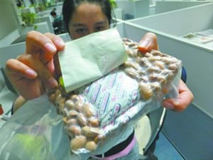 昨日上午,读者卢女士给本报打来电话称,9月12日,农博会开展,她和几个姐妹每人买了两袋大杏仁,每袋标明重量500克。可是昨日一早,卢女士就接到了同伴的电话。“你打开那大杏仁没,里边有一个叫吸氧剂的小袋子,可沉了。 ”