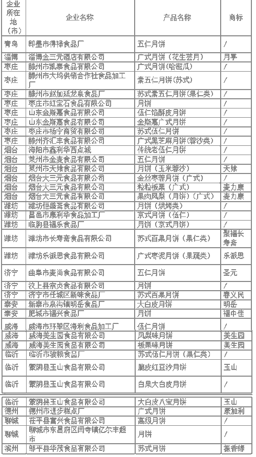据了解,9月3日—18日期间,山东省质量技术监督局根据《中华人民共和国食品安全法》和《山东省食品监督检验工作规范(试行)》的规定,对我省17市的月饼产品的生产加工环节进行了监督检验。