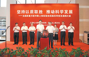 国家质检总局副局长、国家认监委主任孙大伟(前左)、上海市常务副市长杨雄(前右)共同启动上海局“质量月”大型图片展