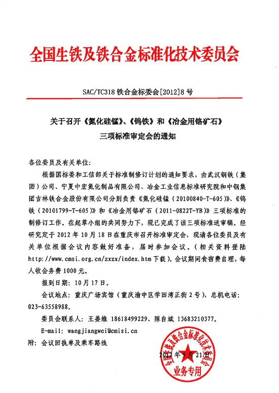 关于召开《氮化硅锰》等三项标准审定会的通知