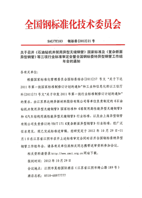 关于《石油钻机井架用异型无缝钢管》审定会议通知