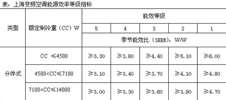 2006年5月29日,上海交电家电商业行业协会举行“2006年中国变频空调能效等级标准说明会”,宣布“经上海市质量技术监督局审查批准,国内首部变频空调能效强制性地方标准自2006年6月1日起在申城全面实施。”该标准规定,变频家用空调的能效水平分为5个等级,1级产品的能效水平达到国际先进水平,5级是市场准入限定指标,不达标的产品将不得进入上海市场进行销售。