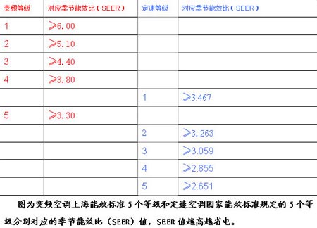 变频空调上海地方标准全称为《变速(变频)房间空气调节器能效限定值及能源效率等级》,该标准将变频家用空调能效水平划分为5个等级,等级1代表国际先进水平,等级5是上海市场准入的限定指标,它是直接相对应于普通定频(定速)空调能效2级水平来制定的(普通定频空调2级被认证为节能产品,EER为3.2)。按照国家标准规定,定速空调的节能级的EER为3.2,根据GB/T7725-2004附录E关于定速空调器SEER的计算方法进行计算,对应EER值为3.2的定速空调的SEER为3.263,而变频空调的入门级即设为SEER3.30,因此变频空调能效限定水平起步较高,而也就是说,同匹数空调变频5级比定速2级节能,变频空调只要是达到该能效标准要求的,就都是节能型的产品。