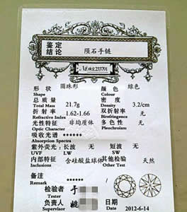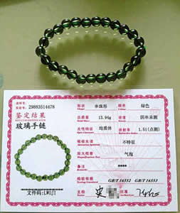 记者在店方提供的手链鉴定证书上看到,该证书是由江苏省连云港质量技术监督金银珠宝饰品产品质量检验站出示,鉴定产品为“陨石手链”,而卢小姐自己鉴定的结果却显示,“紫晶”佛珠为“合成紫晶”佛珠,“陨石”手链和吊坠则由“玻璃”材料制成。