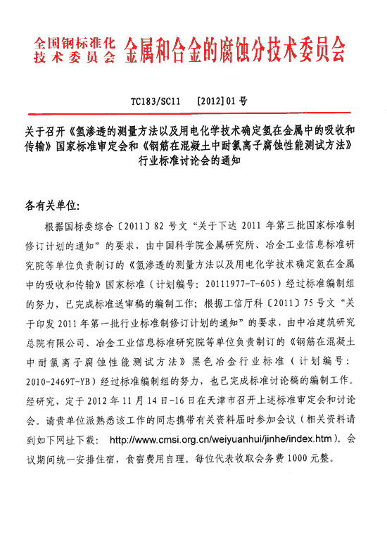 召开《氢渗透的测量方法》国家标准审定会的通知