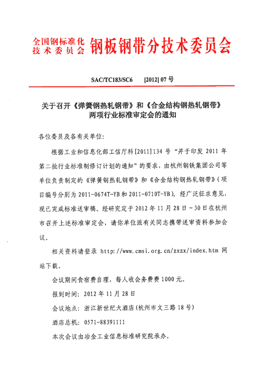 关于召开《弹簧钢热轧钢带》等两项行业标准审定会的通知