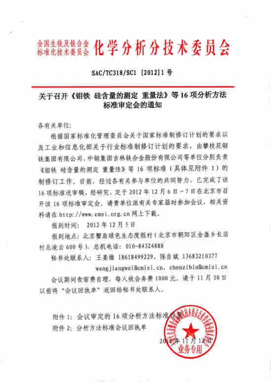关于召开《钼铁 硅含量的测定 重量法》等16项分析方法标准审定会的通知