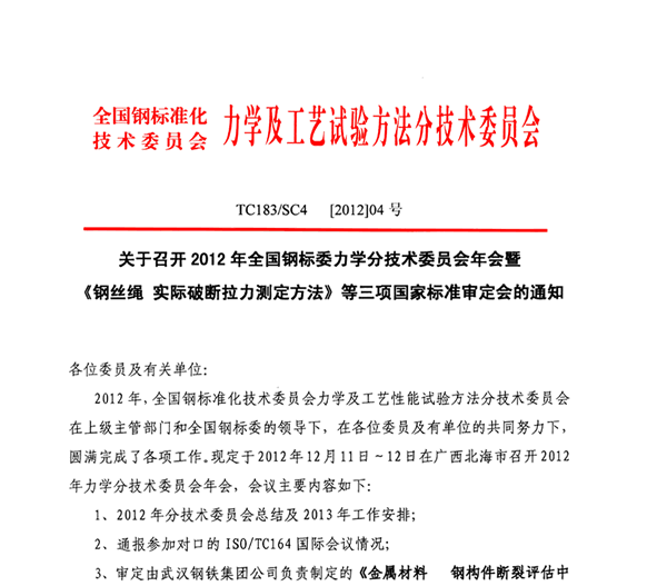 暨《钢丝绳 实际破断拉力测定方法》等三项国家标准审定会的通知