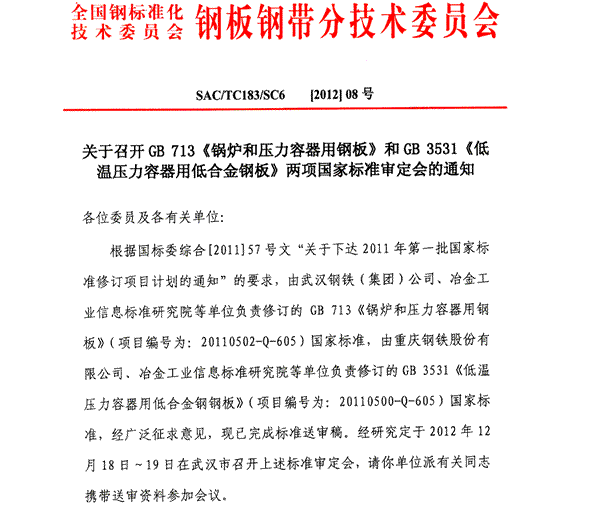 关于召开《锅炉和压力容器用钢板》等两项标准审定会的通知