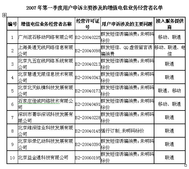 2、2007年第一季度用户申诉主要涉及的增值电信业务经营者名单