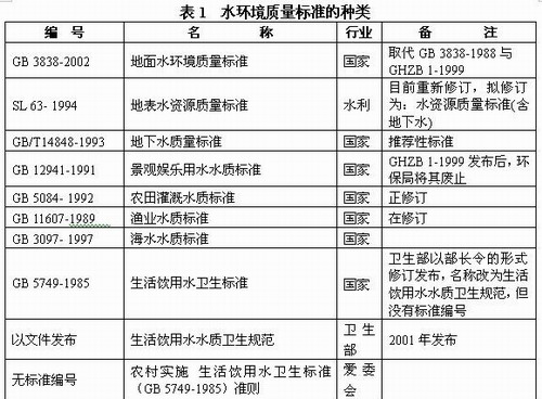 我国的水环境质量标准是根据不同水域及其使用功能分别制定不同的水环境质量标准。主要的水质标准有地表水环境质量标准、地下水质量标准、海水水质标准、农田灌溉水质标准、渔业水质标准、生活饮用水水质标准、各种工业用水水质标准等。标准也分成强制标准和推荐性标准两种,国家和行业标准两类,共计46项(表1)。