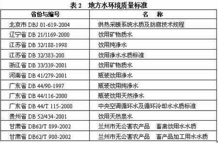 此外,各地也制定了一些水环境质量地方标准,共12个(表2)。如北京、辽宁、江苏、山东、甘肃等省市。主要制定的是纯净水方面的标准。