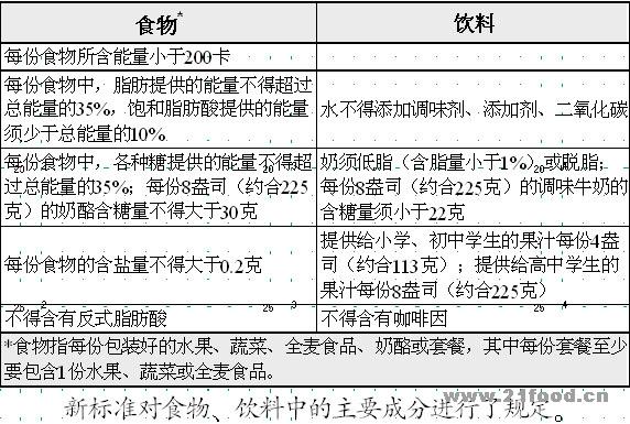 这份标准是美国医学研究所应国会要求而制订的。4月底,研究所向国会及农业部报告了他们设计的标准。这份标准以《美国膳食指南》为基础,适用于4—18岁的学生。对于所有中、小学生在上课期间的饮食,该方案的要求如附表所示。对于高中生,放学后可在校园内购买快餐食品,但每份快餐食品的要求与附表相同;高中生在放学后还可饮用含调味剂、二氧化碳的饮料,但每份饮料的能量不得大于5卡,且不得含有咖啡因。学生自己从家带往学校的饮食将不受这份标准的约束。
