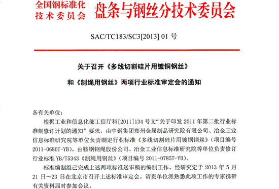关于召开《多线切割硅片用镀铜钢丝》和《制绳用钢丝》两项行业标准审定会的通知