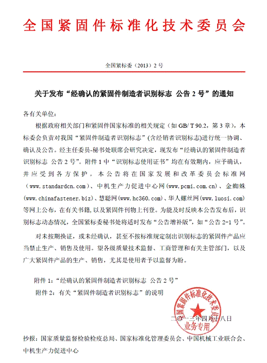 关于发布“经确认的紧固件制造者识别标志 公告2号”的通知