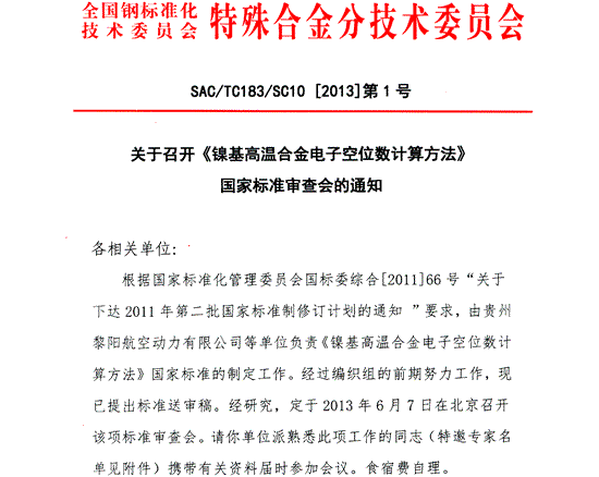 召开镍基高温合金电子空位数计算方法审查会的通知