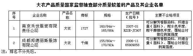 抽查结果表明,一是抽查涉及人身健康安全的甲醛含量、pH值及产品标识三项指标均符合标准要求。二是抽查的11种男式大衣产品质量全部合格。三是与2006年抽查的大衣产品相比产品抽样合格率提高了11个百分点。