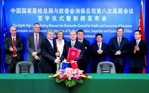 6月7日,国家质检总局与欧委会健康与消费者保护总司第八次高层会议在北京举行。双方就食品农产品市场准入、检验检疫等问题进行了深入交流,同意在进出境旅邮检业务领域加强合作,并签署了相关协议。国家质检总局局长支树平、欧盟委员会卫生和消费者政策委员托尼奥·博奇签署会议纪要并分别致辞。