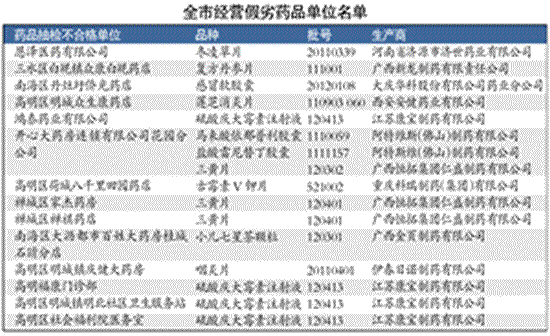 6月13日下午,广东省食品药品监督管理局公布了《2013年第一季度广东省药品质量公告》。抽检结果显示,佛山16批药品进入省药品质量公告“黑名单”,其中包括高明区两家公立性质的社区卫生服务站和医务室的硫酸庆大霉素注射液不合格。在被曝光的零售药店方面,本土著名连锁药店开心大药房连锁有限公司花园分公司有3批药品被检出不合格。此外,其余被曝光假劣药品主要为三黄片、咽炎片等家庭常用药品。
